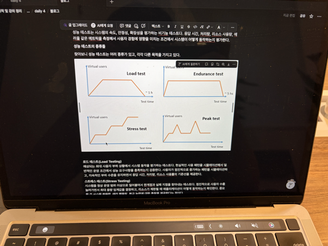 오늘은 검색 API 개발하면서 레디스를 살짝 맛보기로 봤고(Cacheable, CacheEvict 정도), 댓글이랑 태그 API도 구현했다. 레디스는 다음 프로젝트에서 더 깊게 다룰것 같아서 그때 다루는 것으로, 그리고 본격적으로 성능 테스트 파트로 넘어갔다. 강의에서는 스트레스 테스트, 스파이크 테스트, 인듀런스 테스트 같은 성능 테스트 종류들을 소개하고, Locust로 실제 시나리오를 돌려보는 걸 배웠다. JMeter, Gatling 같은 도구들도 간단히 소개받았고.강의에서 성능 테스트 이야기 나왔으니 이론적인 내용과 툴들에 대한 내용들을 궁금해서 추가적으로 찾아봤다.