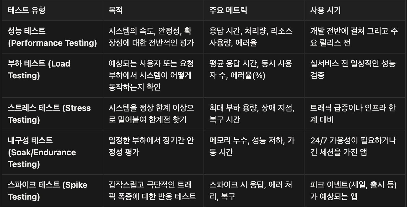찾아보니 성능 테스트는 여러 종류가 있고, 각각 다른 목적을 가지고 있다.
