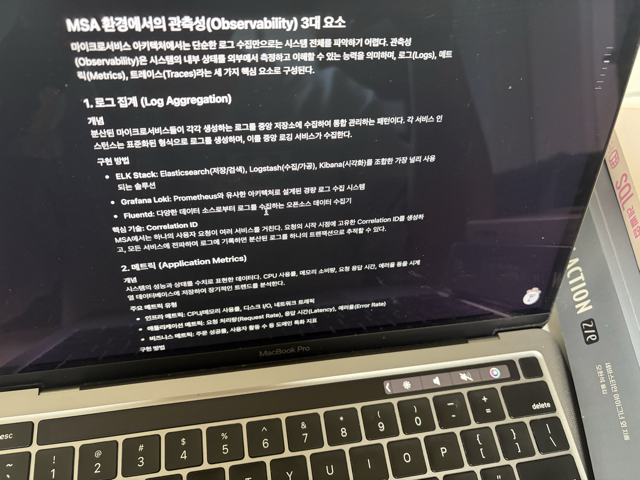 예외 처리 부분에서는 전략을 전역 예외 처리, 특정 예외 처리, 사용자 정의 예외 클래스, 트랜잭션 관리 등을 언급해주셨고 @ControllerAdvice를 사용한 전역 예외 처리 정도 실습 내용이었다. 간단한 오버뷰 정도의 챕터였던 것 같고 많은 내용이 있지가 않은터라 MSA 관측성에 대해 추가로 학습했다.