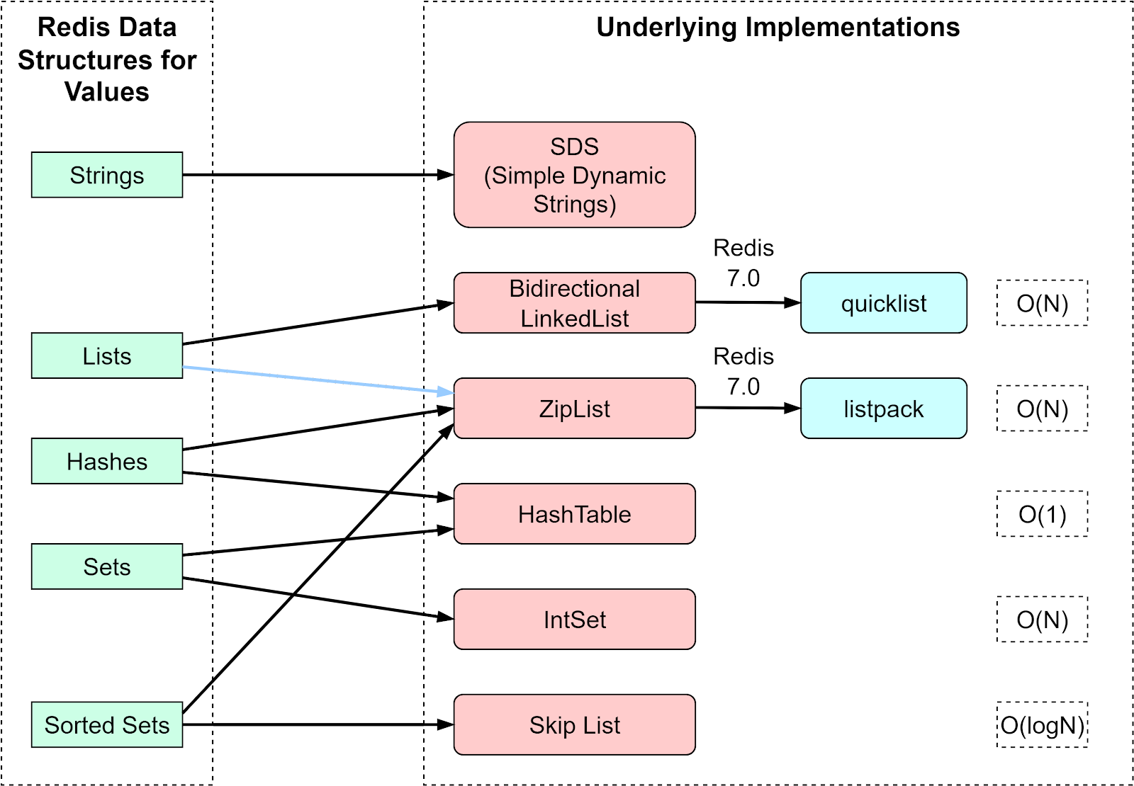 - Redis 7.0은 List 구현을 quicklist로 변경했으며 ZipList는 listpack으로 대체되었다고 한다.